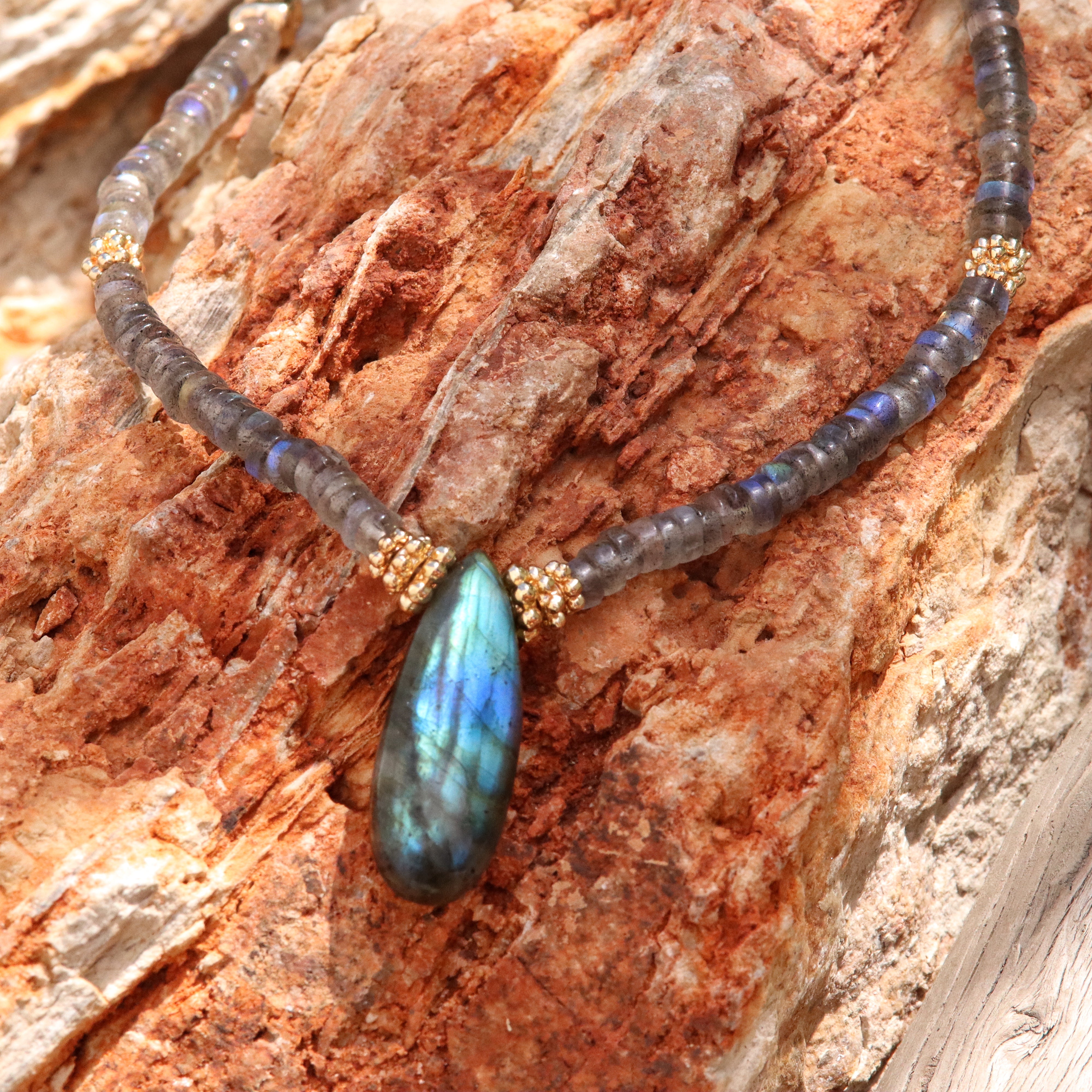 This splendid labradorite necklace was created with intention and entirely handcrafted in Switzerland. Inspired by the jewelry of ancient civilizations, it is a piece of character, imbued with mystery and power.